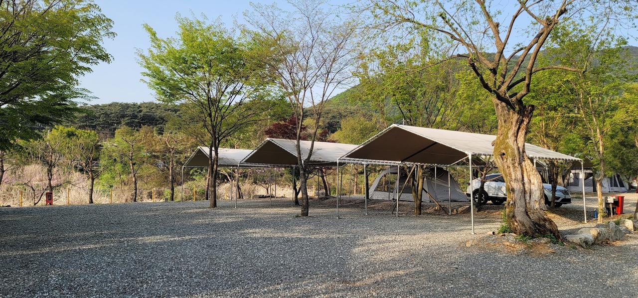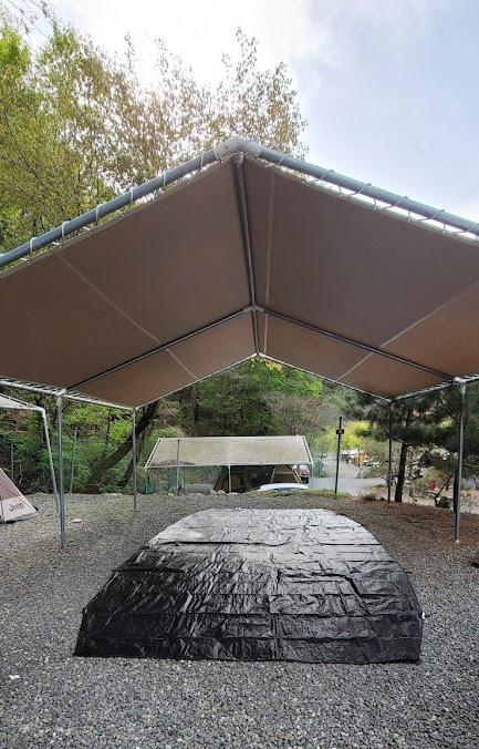예약한 사이트에 도착하면 아래 사진과 같이 타프(글램핑 지붕)가 쳐져 있어요!