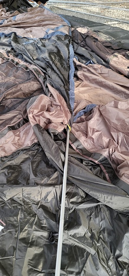 메인 폴대인 노란색 폴대와 검은색 폴대를 먼저 끼워준 후, 텐트를 일으킵니다.