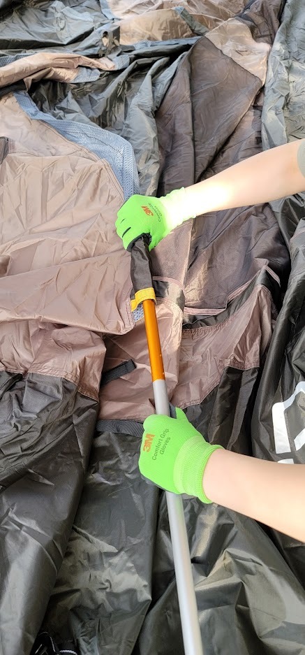 텐트가 잘 일으켜 세워지면 폴대를 고정해주고, 텐트의 천에 붙어있는 고리들을 폴대에 연결해 주는 것으로 마무리합니다.