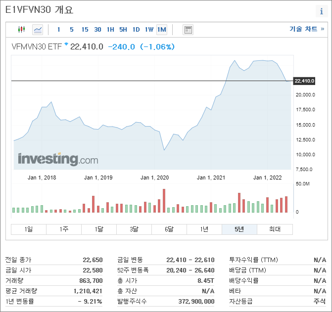 VN30은 베트남 대표 대형주 30개를 지수화한 것인데요, 이 지수를 추종하는 ETF라고 보시면 됩니다.