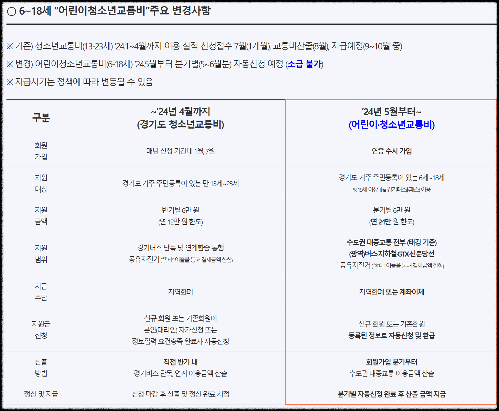 2024년 5월부터는 만 6세~만18세 어린이와 청소년으로 지원대상이 변경되었다는 점입니다.