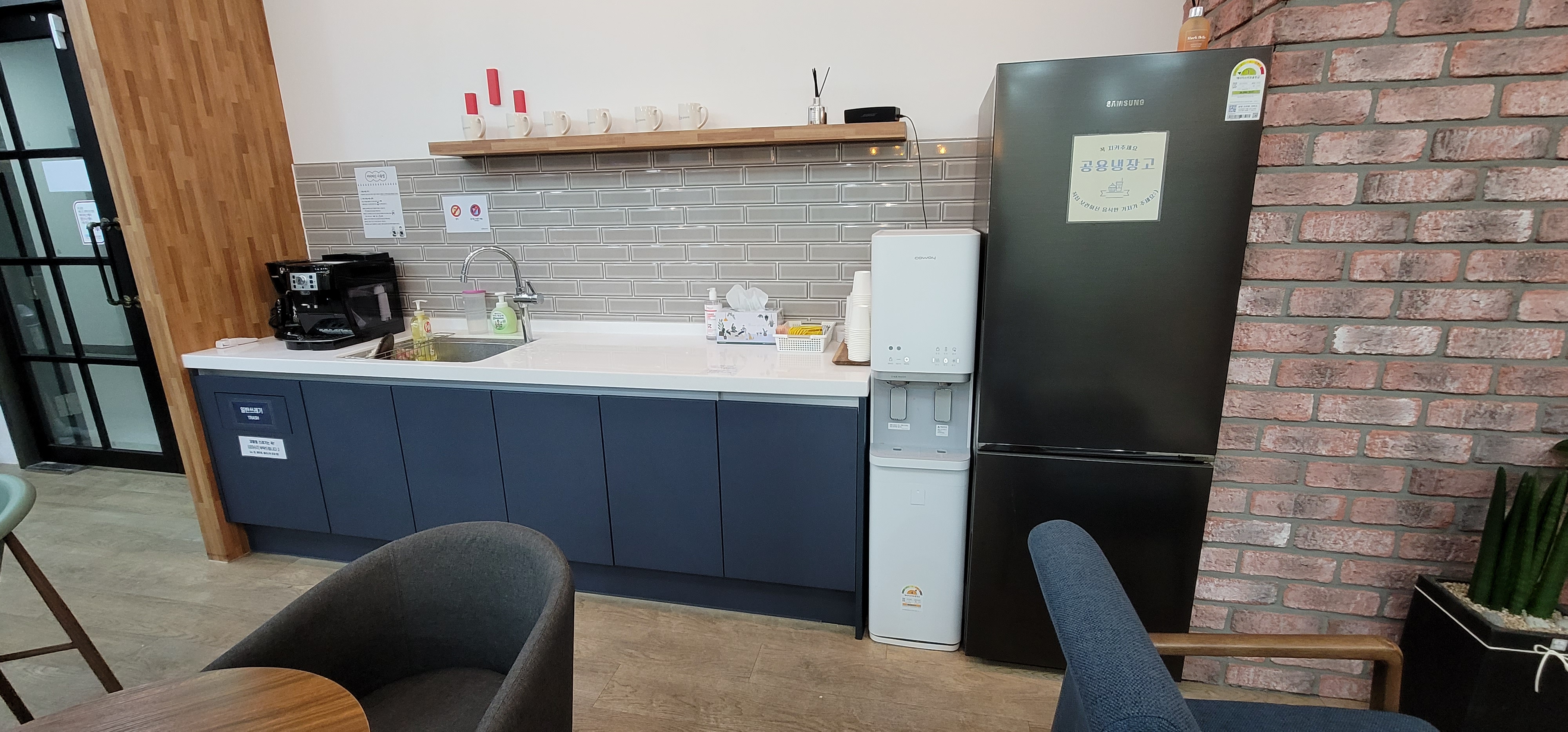 공용 카페테리아에는 소개해드린 드롱기 커피머신 외에도 공용 냉장고, 정수기가 구비되어 있어요.