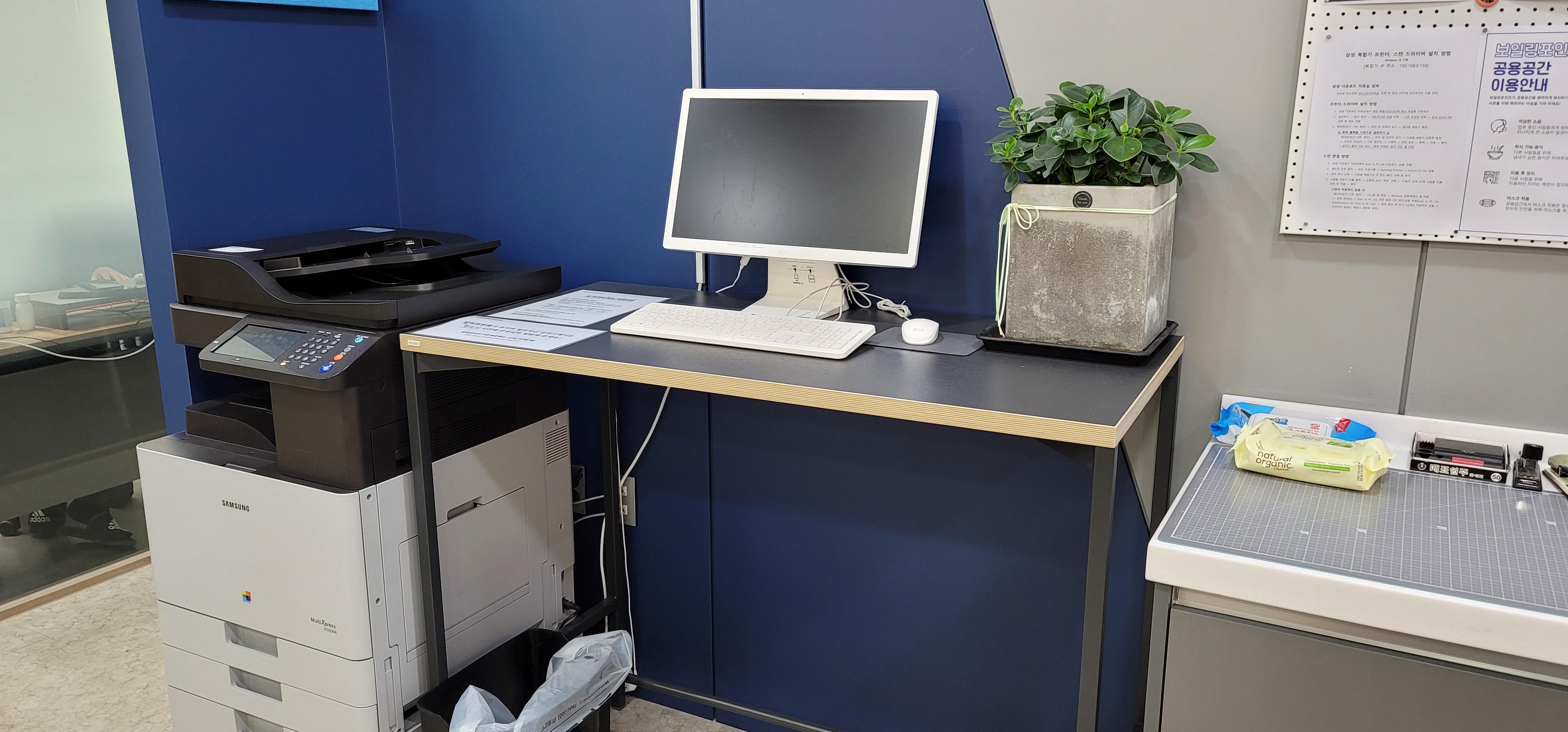 OA공간에는 컬러 복합기와 공용PC, 세단기도 준비가 되어 있고요, 기본적인 사무용품도 입주사 분들이 자유롭게 사용할 수 있게 늘 구비가 되어 있습니다.